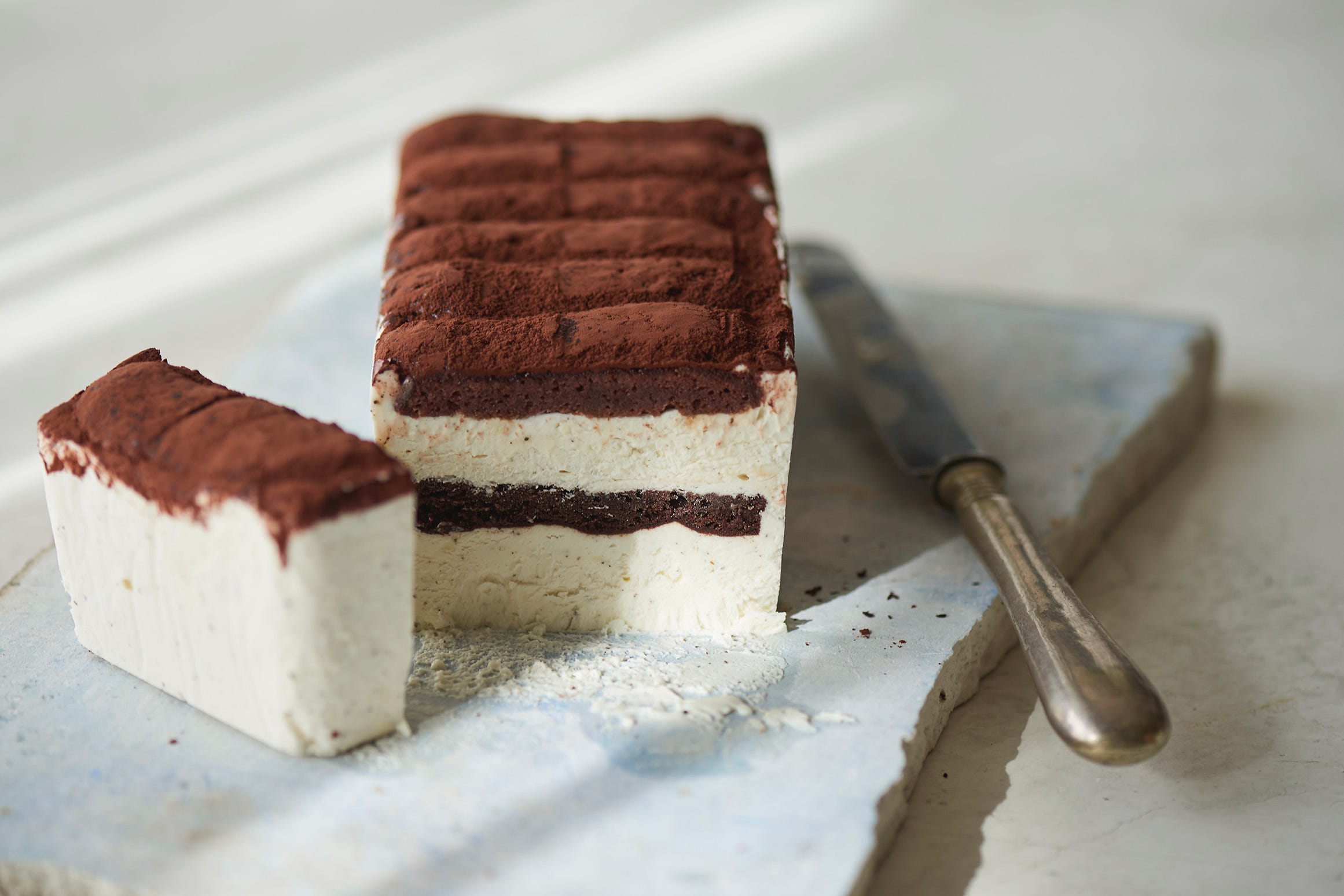 「tiramisu」3,780円 お酒も小麦粉も使用せず、はかない口溶けを実現した「ティラミス」。おすすめの食べ方は、冷凍。甘さよりもカカオの味わいやコーヒーの香ばしさが引き立つそう。溶けやすい商品なので、冷凍のままカットした後は、温度によって変化する味わいと香りを堪能できます。冷たい口溶けは、暑い日のおやつにもぴったりです。