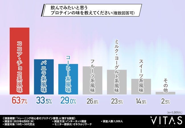 トレーニングを始めたばかりの10代~30代の男女1,009人に、「飲んでみたいと思うプロテインの味を教えてください(複数回答可)」と質問したところ、以下のような回答が返ってきました。