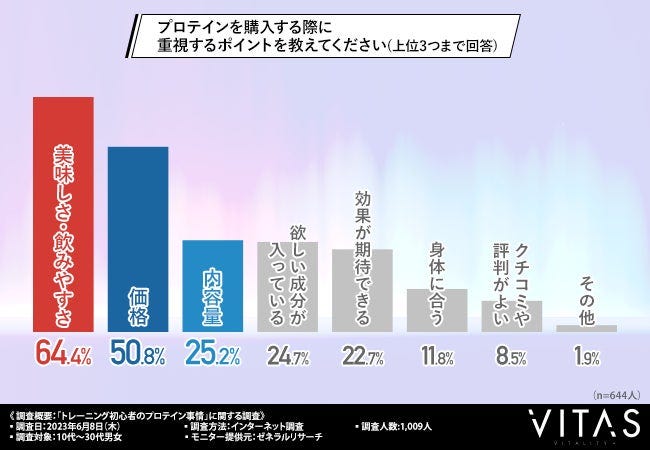 「プロテインを購入する際に重視するポイントを教えてください(複数回答可)」と質問したところ、『美味しさ・飲みやすさ(64.4%)』と回答した方が最も多く、次いで『価格(50.8%)』『内容量(25.2%)』という結果となりました。