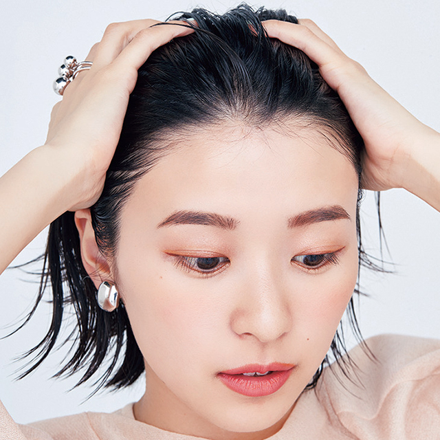 手ぐしで前髪と後ろ髪をかきあげながら膨らみやすいハチは手のひらで押さえる。頭が小さく見える効果が。