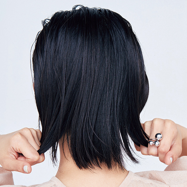 手に余ったジェルは毛先にまでしっかりのばす。Cラインを意識して束感とツヤ感を細部にまで仕込んで。