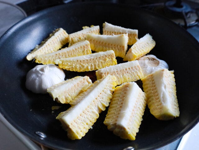 ② フライパンにオリーブオイルをひき、とうもろこしの実が付いた方を下にし、にんにくは横半分に切り、切り口を下にして入れる。