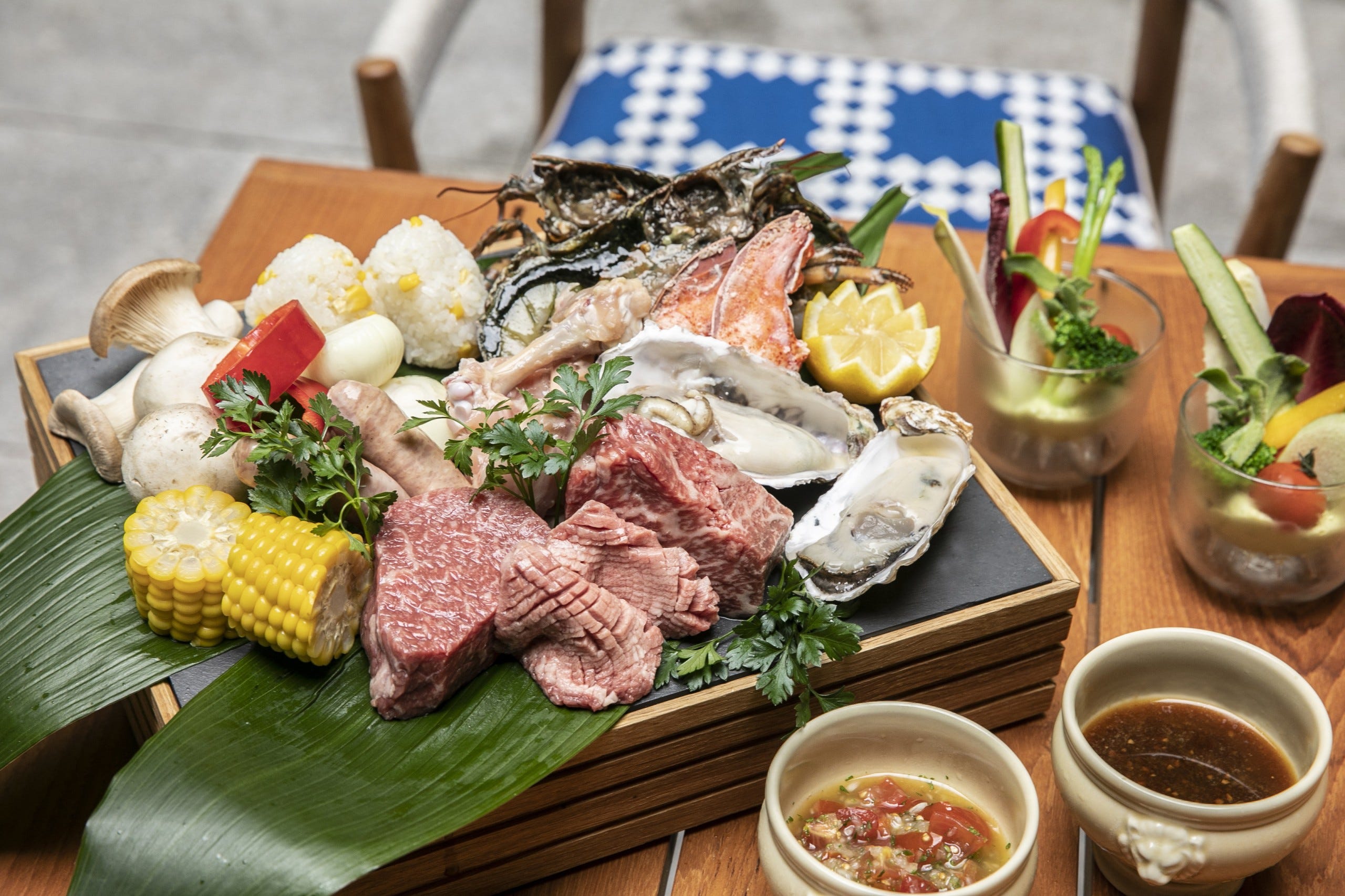 宮崎中村牛(黒毛和牛)サーロイン50g、赤身50g、US牛タン20g、ソーセージ、鶏手羽元、オマール海老、牡蠣、焼き野菜(イタリアンパプリカ、エリンギ、万願寺唐辛子、ミニ玉ねぎ、マッシュルーム、とうもろこしなど)、焼きおにぎり