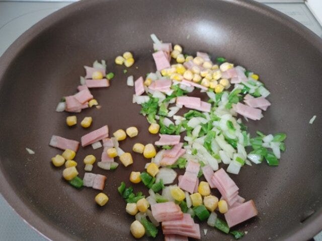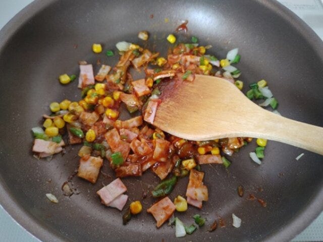 ③ 玉ねぎが透明になってきたらベーコンを加え炒め、コーンも加え炒める。
