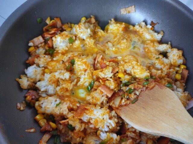 ⑥ ごはんを加え、よく混ぜながら炒める。ご飯がとソースがなじんできたら、卵を加え、全体が均一になるまで炒める。
