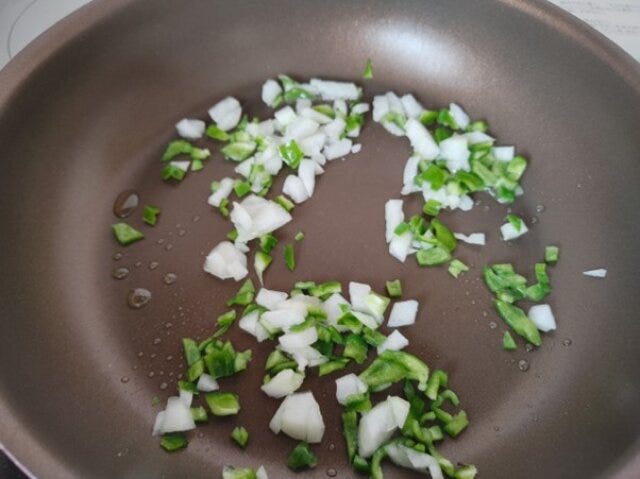 ② フライパンにサラダ油を熱し、玉ねぎとピーマンを炒める。