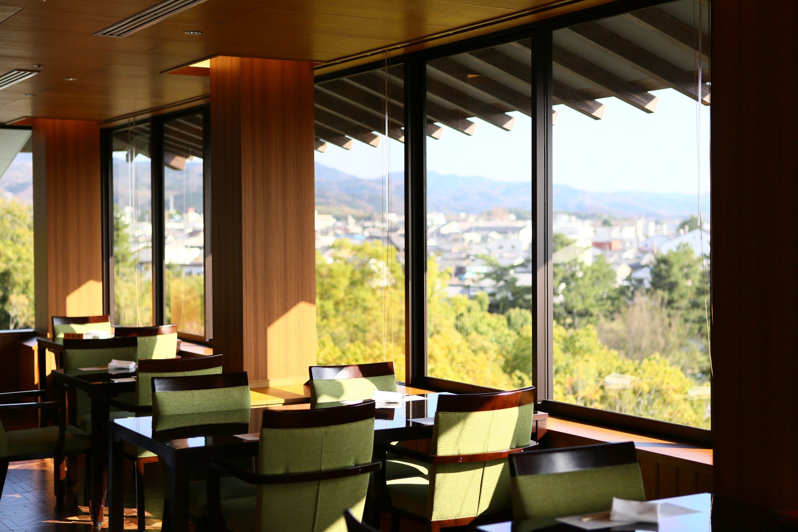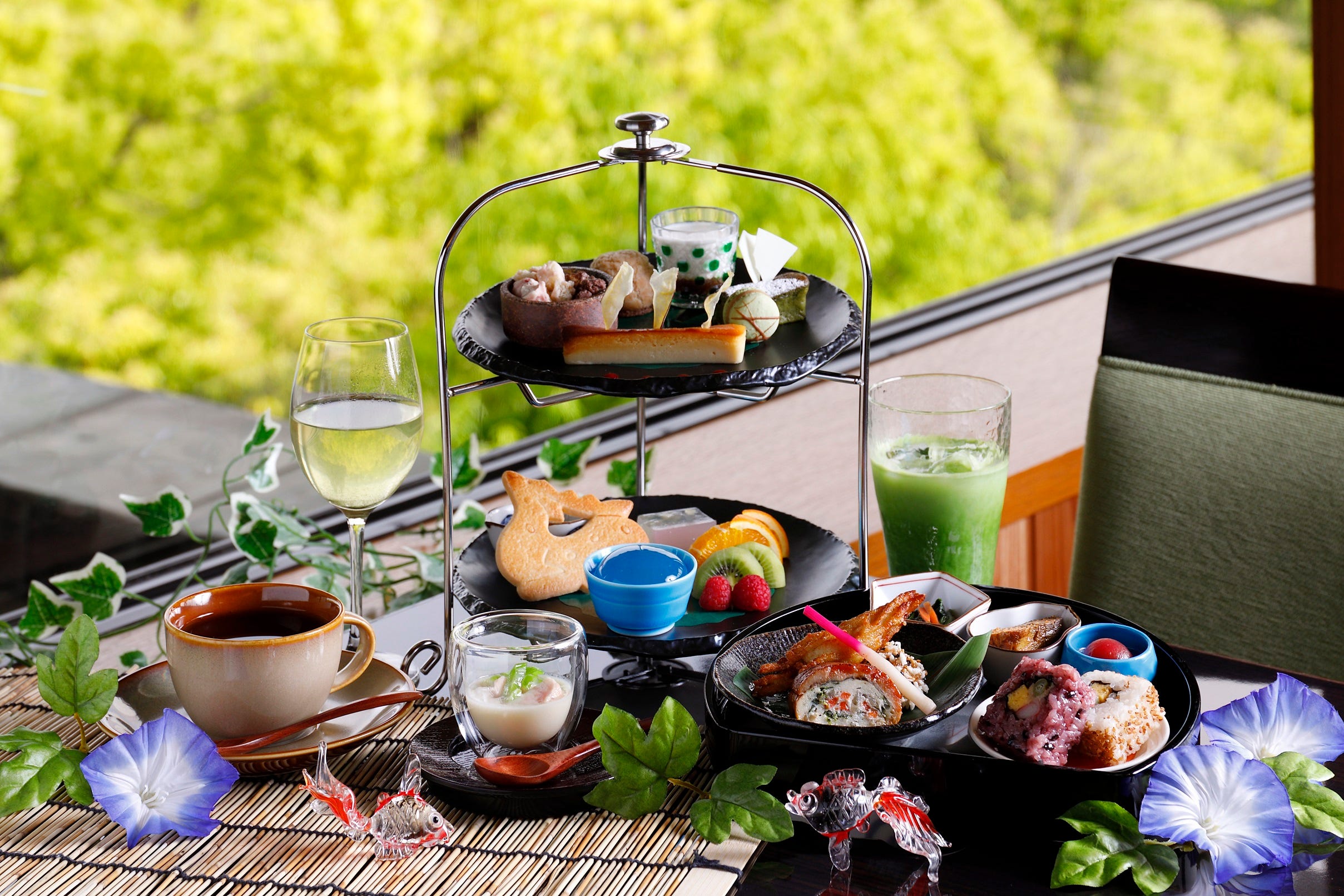 「和風アフタヌーンティー」は、落ち着いた和の空間、日本料理「花菊(はなぎく)」で提供されます。大きな窓からは鮮やかな緑が美しい山々を見渡すことができ、開放感も抜群です。
