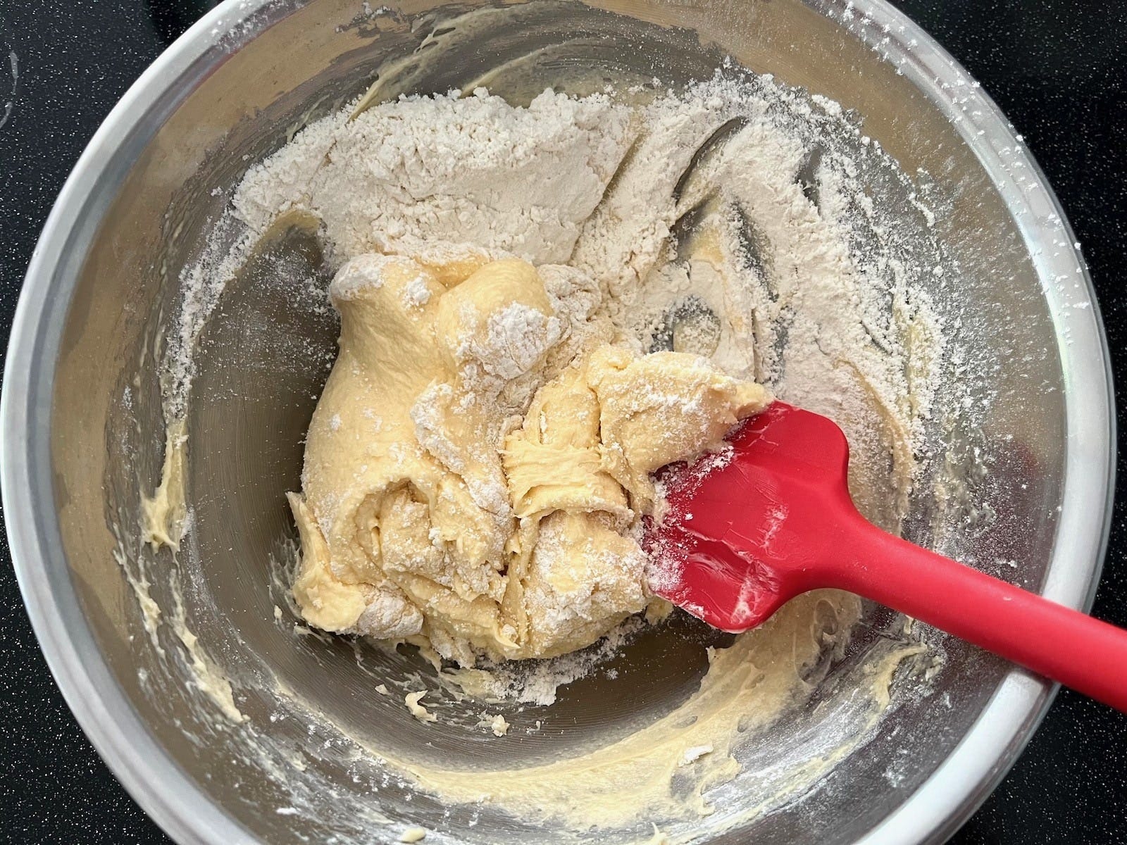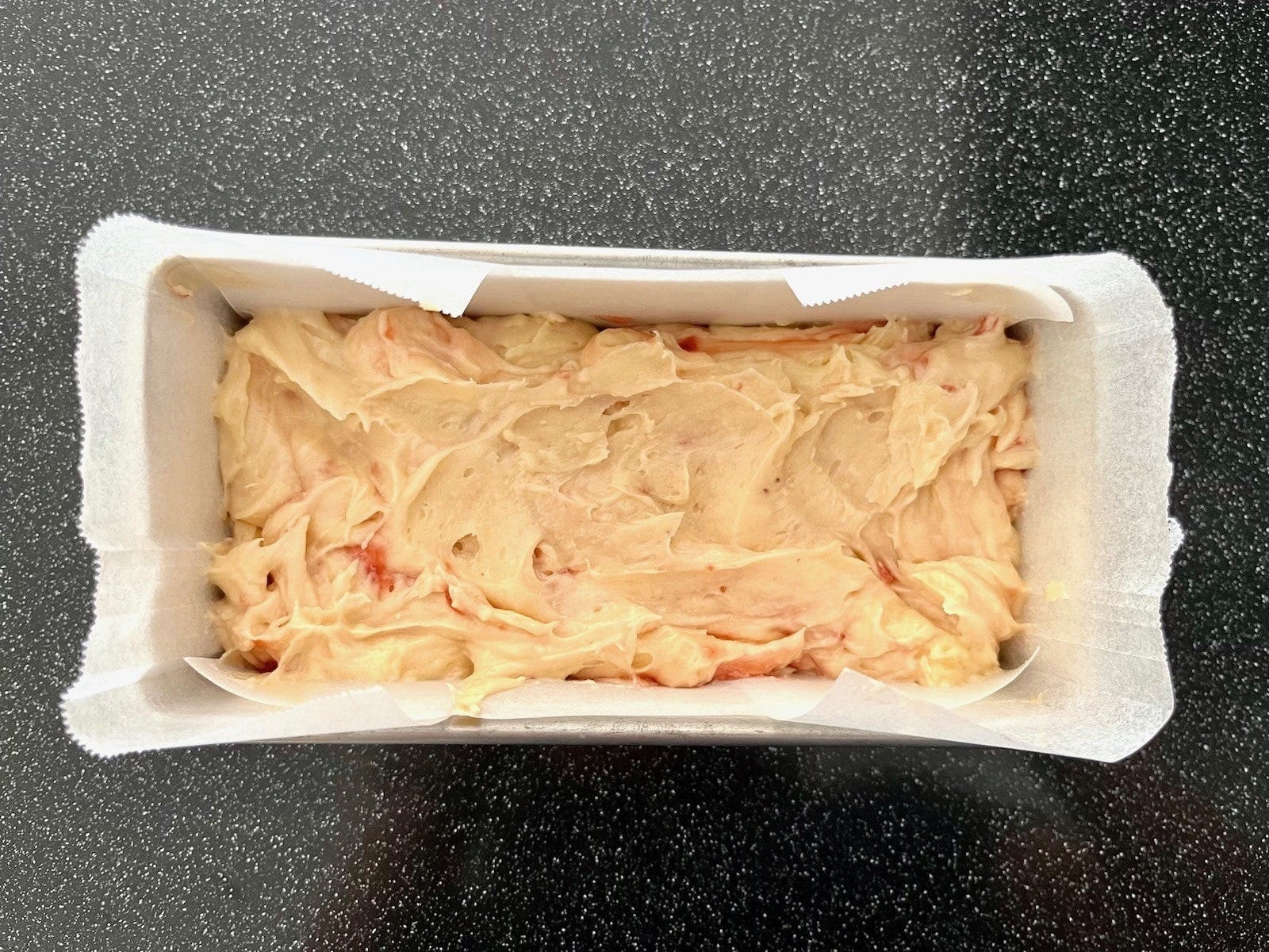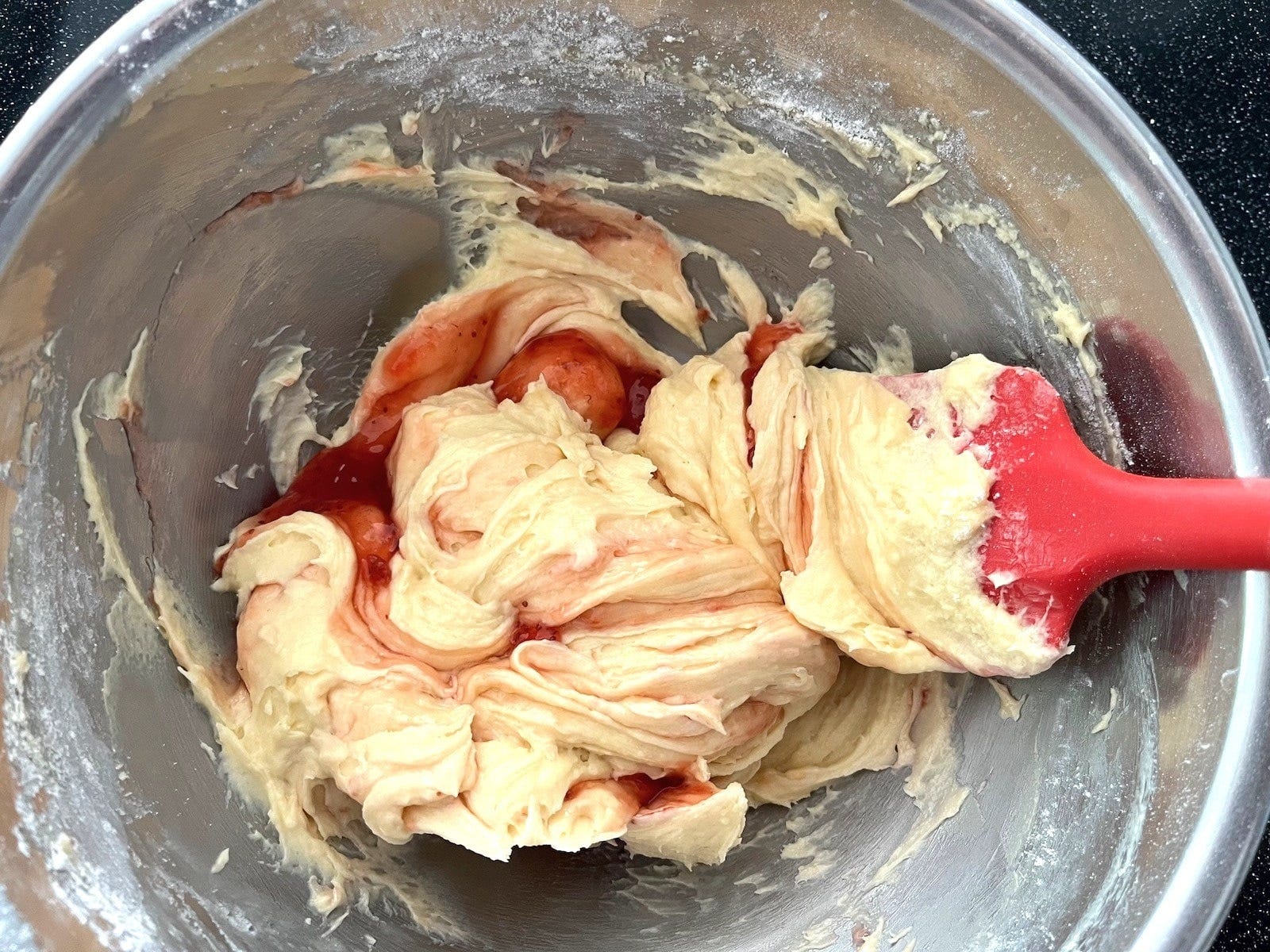いちごジャムを加え、ゴムべらで全体をざっと混ぜます。このとき、生地とジャムを均一に混ぜてしまうと焼き上がりの切り口がマーブル模様になりませんので、全体を混ぜすぎないように注意します。