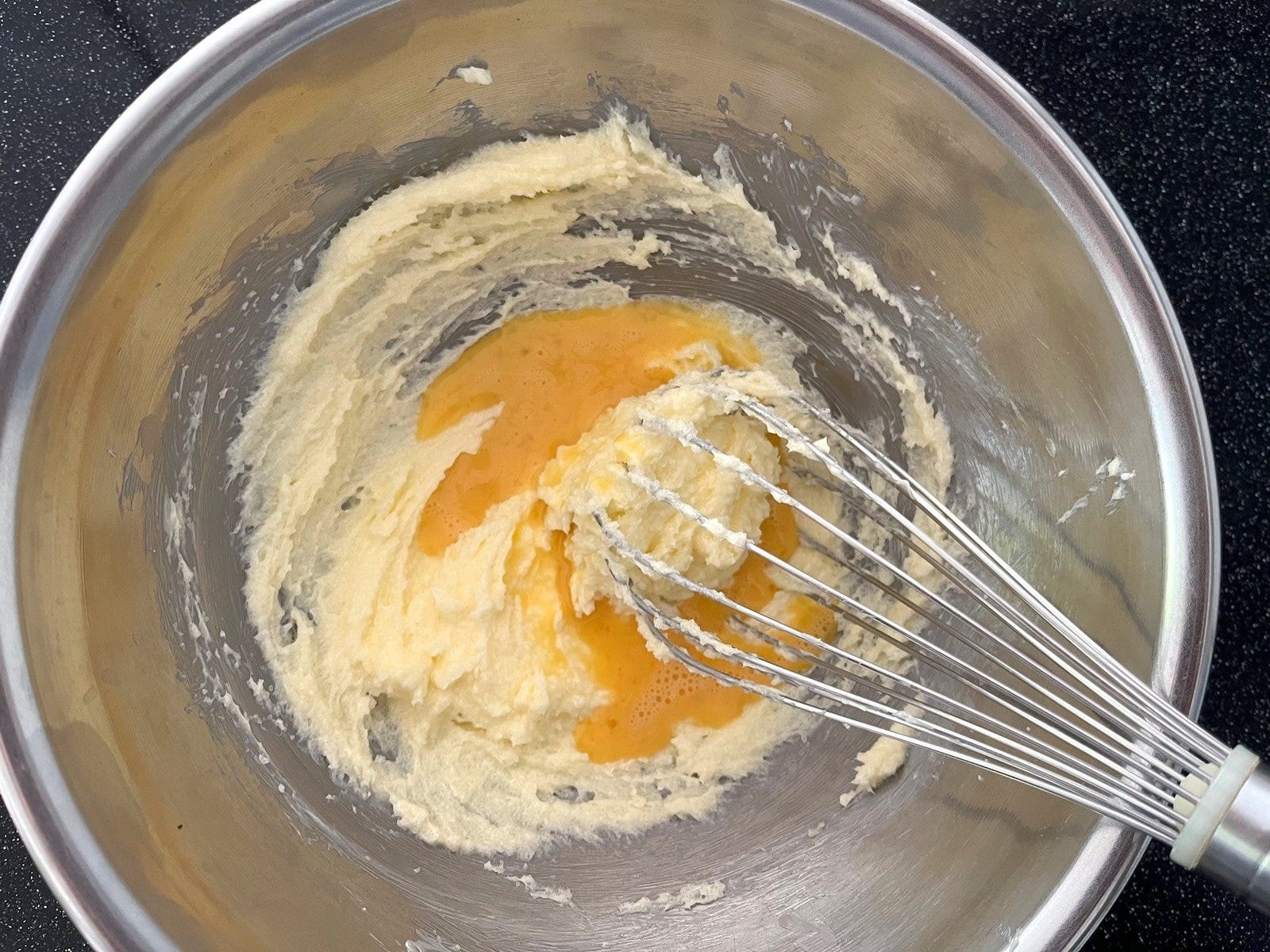 解きほぐした卵を2~3回に分けて加え、そのつど、泡立て器でよく混ぜます。