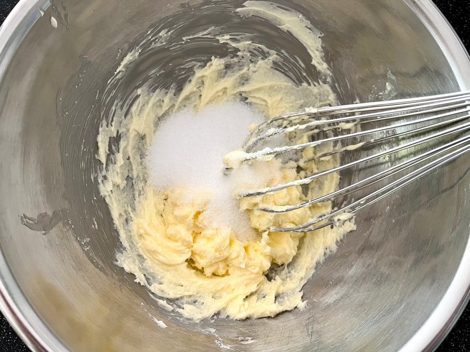 バターと卵は必ず室温に戻しておきます。バターを泡立て器で練り混ぜて、空気を含んで白っぽいクリーム状になるまで混ぜます。グラニュー糖を加え、さらにざらざらがなくなり、クリーム状になるまでよく混ぜます。