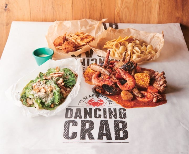 【ディナー限定】DANCING CRAB(南館8F)「大集合コース」5,000円 ※2名から注文可 カニやエビ、野菜を手づかみで豪快に楽しむコンボバッグ。スパイシーソースがたっぷり絡んだシーフードは熱い夏にぴったり。そのワイルドさに盛り上がること確実です。