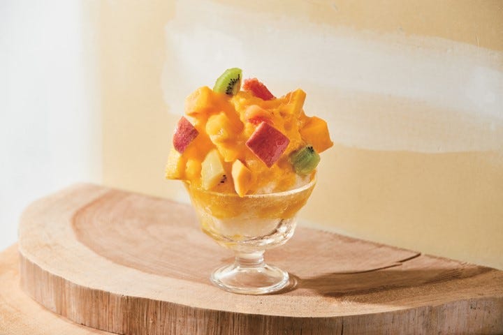 【夏季限定】堀内果実園(南館B1F)「台湾トロピカル」1,280円 奈良の果実園が手掛けるカフェには、マンゴー、パイン、リンゴ、グレープフルーツ、キウイの果肉がゴロゴロ入った「台湾トロピカル」が登場。とろっと濃厚なマンゴーソースをたっぷりとかけた、南国感あふれるかき氷です。