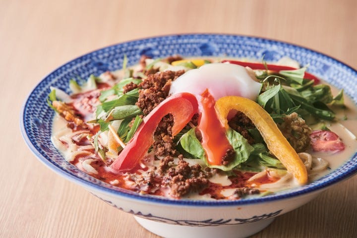 【イベント限定】担担麺の掟を破る者(南館7F)「冷製豆乳たんたん麺」1,397円 黒ごまを練り込んだ麺に、野菜、ひき肉、レンコンチップ、温玉をトッピングした「冷製豆乳たんたん麺」。醤油のかえしと練りごまを加えた豆乳ベースのひんやりスープは、飲み干したくなる味わいです。
