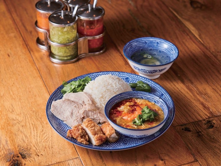 【イベント限定】mango tree kitchen “khao man gai”(うめきた広場B1F)「クンパッポンカリー&ダブルカオマンガイ」1,419円※1日10食限定 カリッと香ばしい“揚げ”と、しっとり食感の“茹で”の両方が楽しめる「カオマンガイ」を、卵でとじた海老のカレー風味炒めと一緒に召し上がれ。