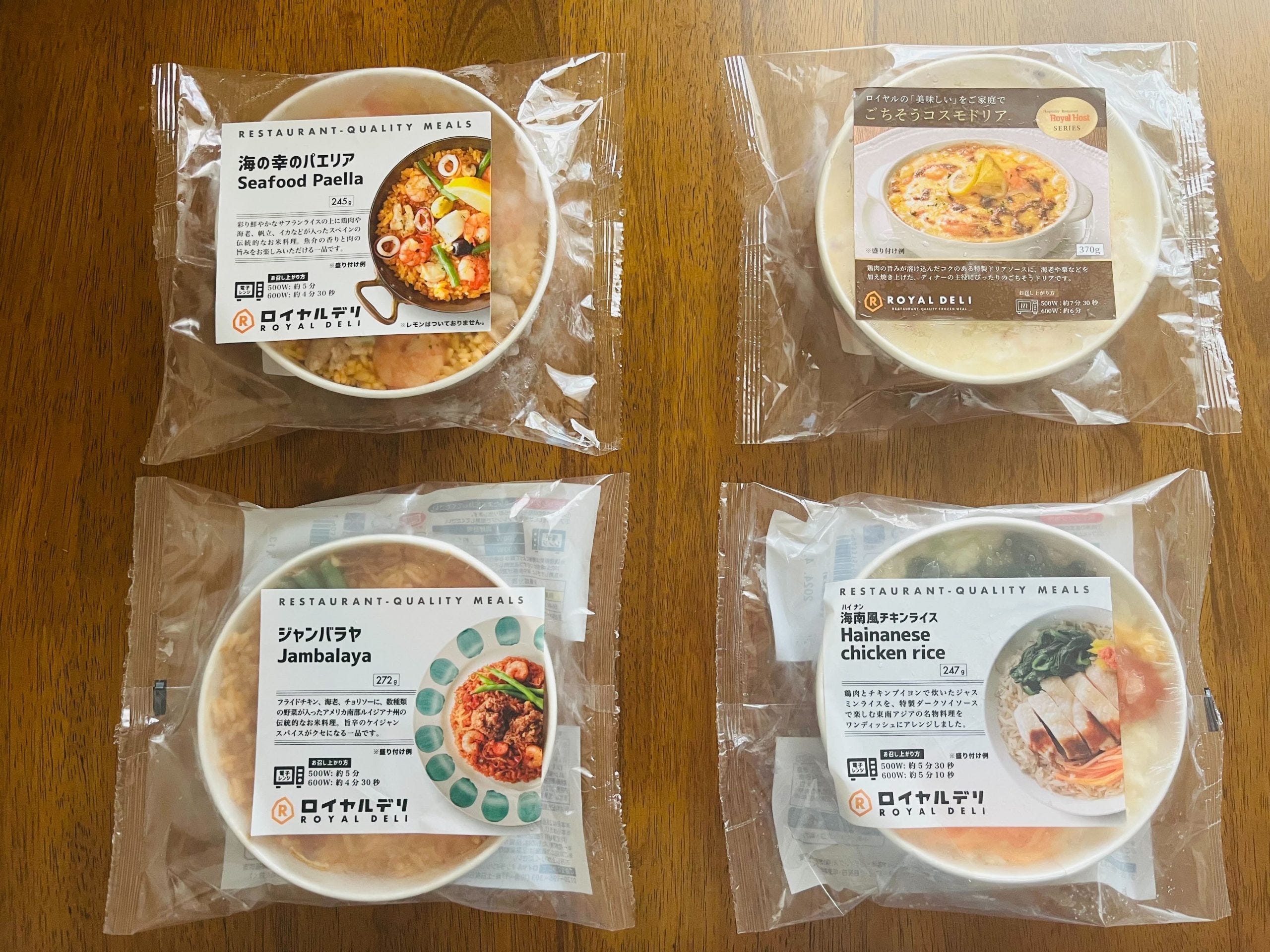 鶏肉の旨みと魚介の香りが凝縮された「パエリア」、本格的なハーブ&スパイスが楽しめる「ジャンバラヤ」、香り高いジャスミンライスが特徴「海南風チキンライス」、ロイヤルデリを代表する人気商品「コスモドリア」がセットになっている商品です!