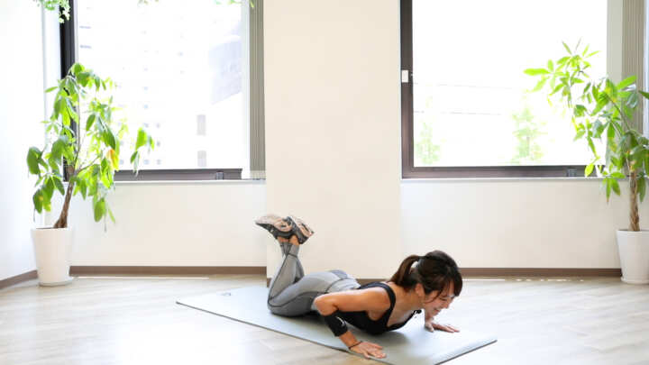 - 腕立て伏せができない人向け。「膝つきプッシュアップ」で胸と二の腕を鍛える