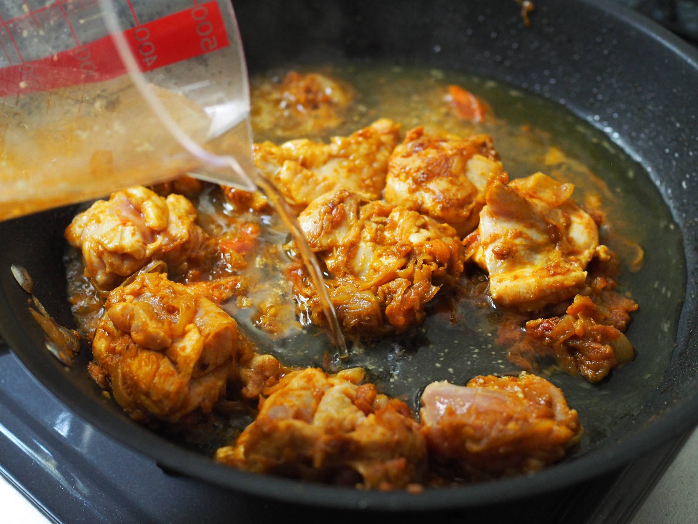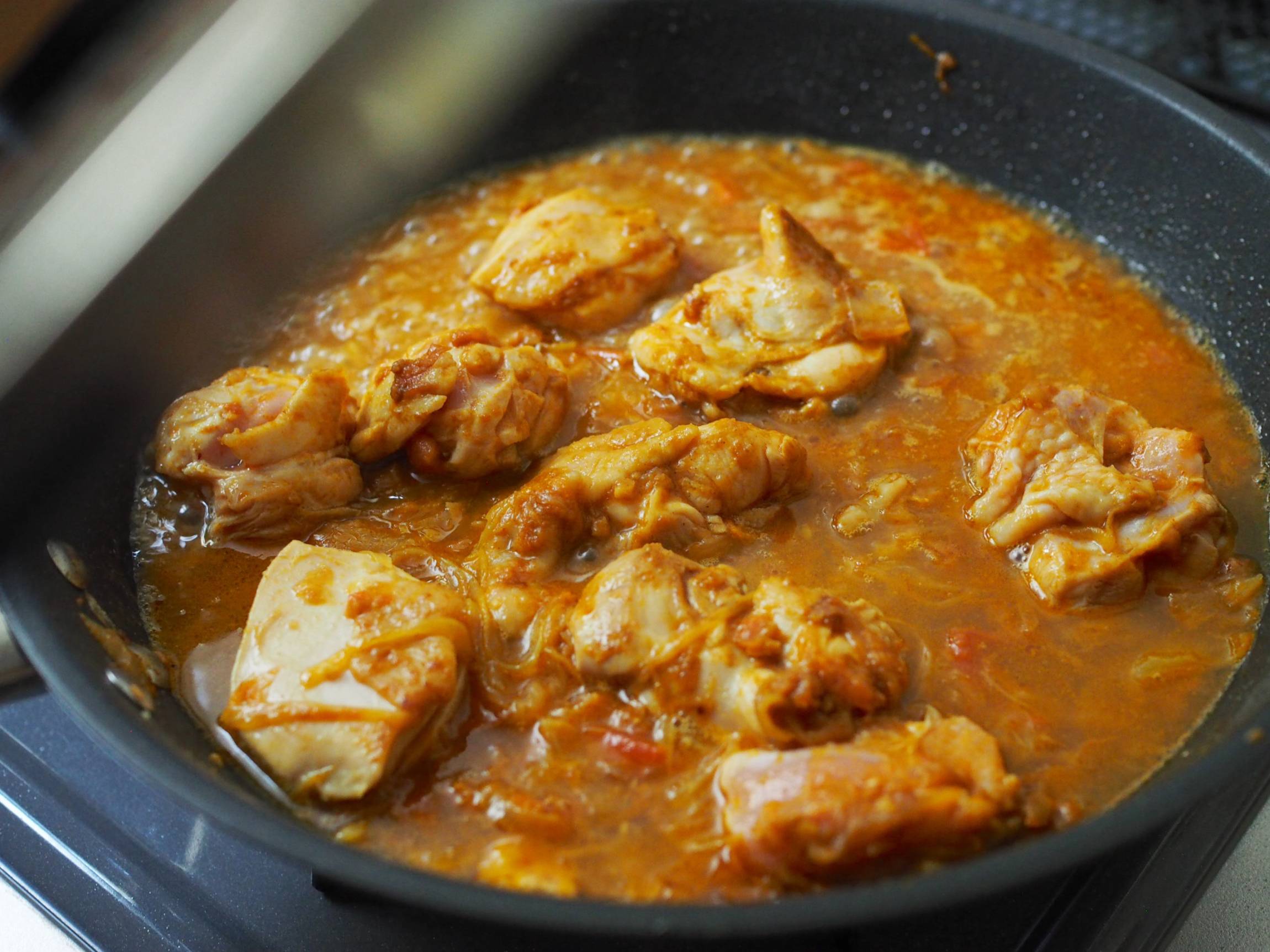 フライパンに蓋をして中火で5〜8分ほど煮込みます。 ※鶏もも肉の大きさによって煮込み時間が異なります。