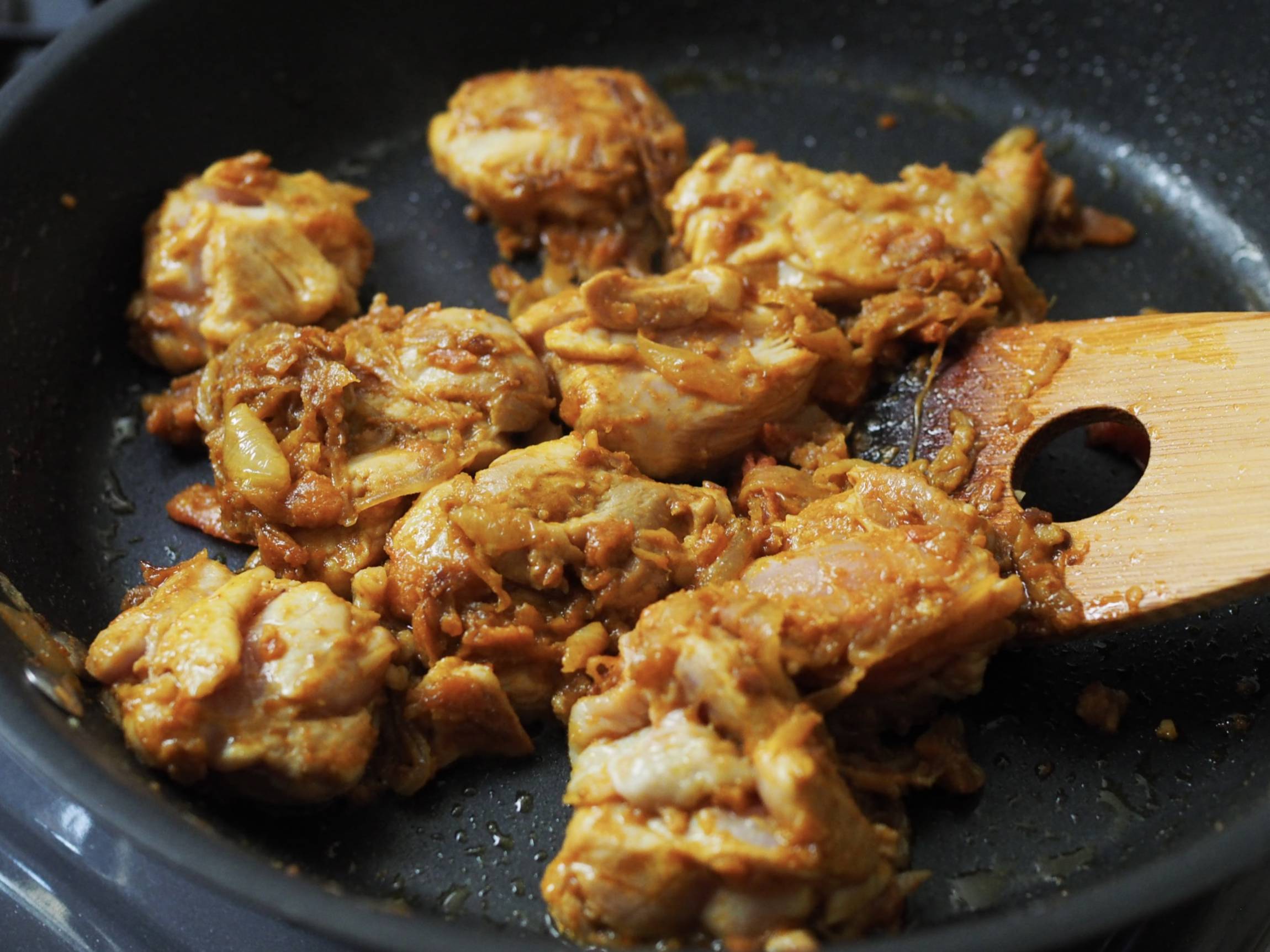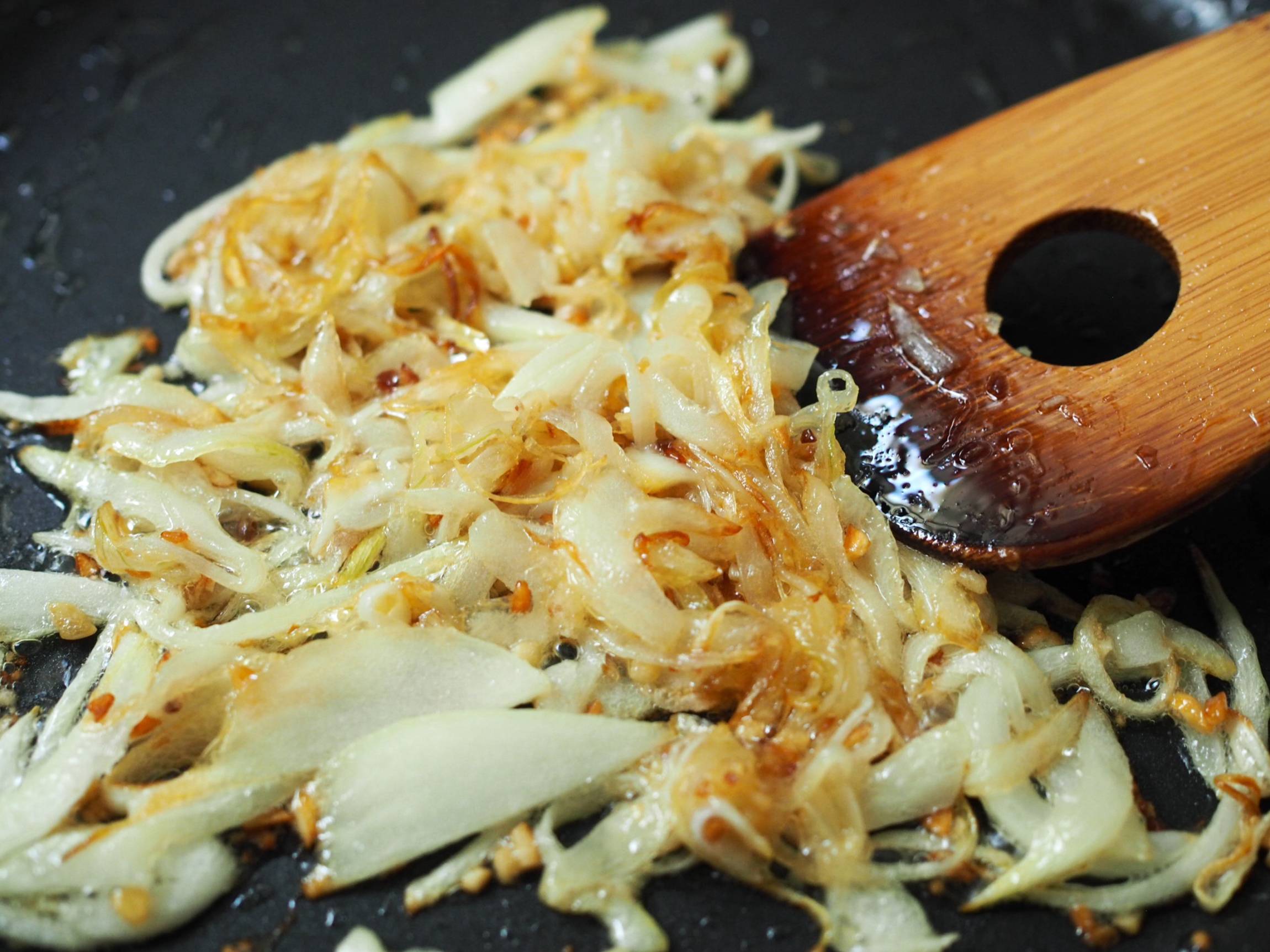 玉ねぎを入れ、きつね色になるまで中火で炒めます。