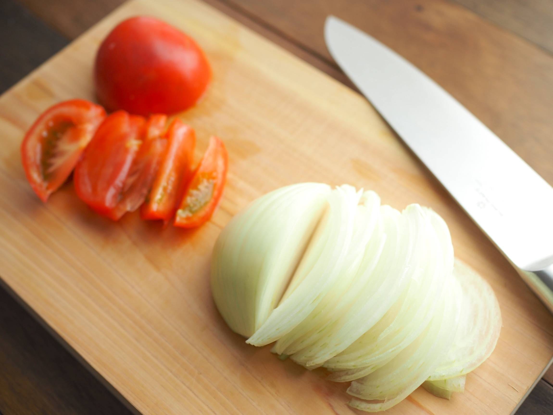 玉ねぎは薄切りに、トマトはくし切りにします。