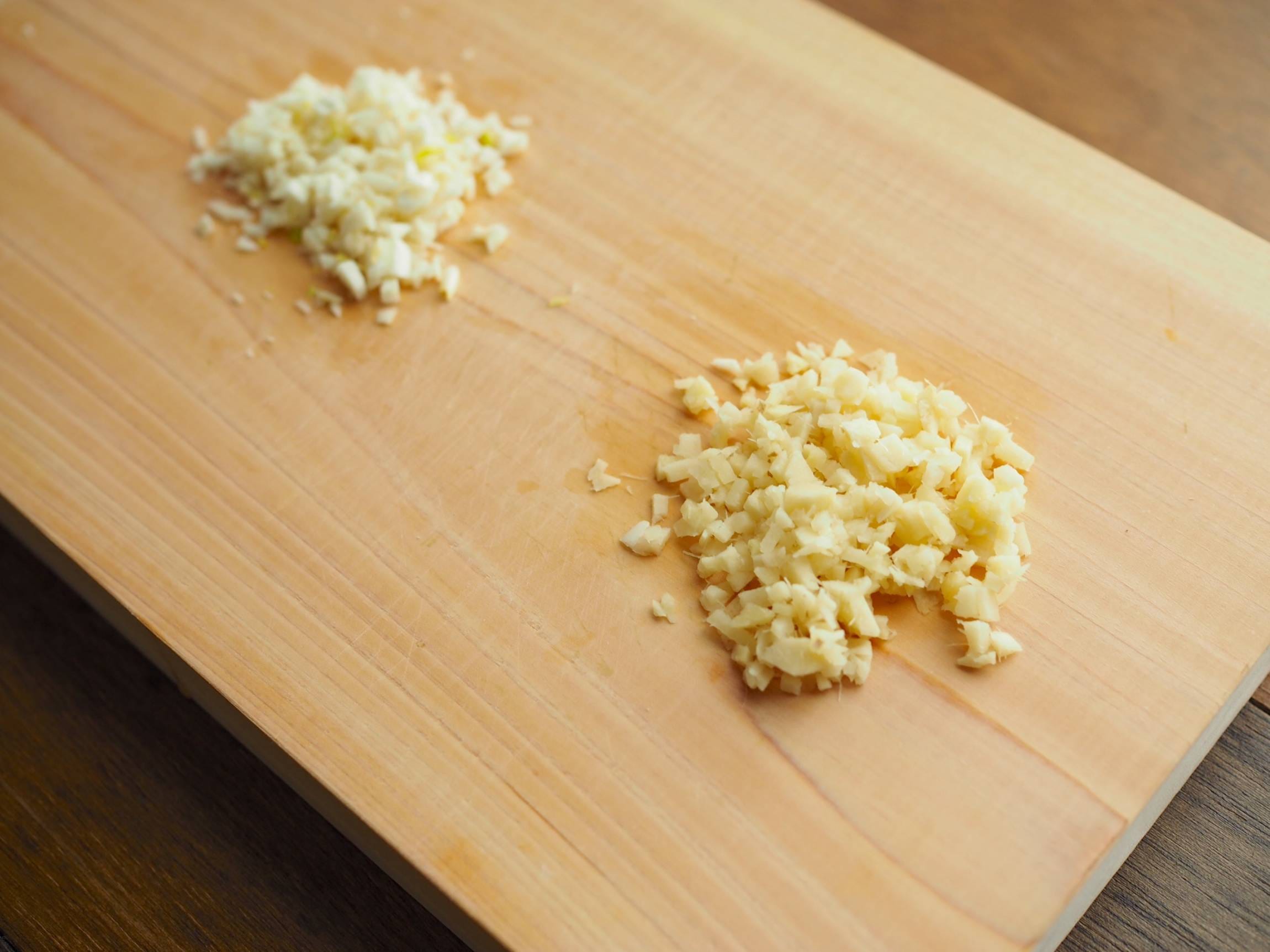 にんにくとしょうがは皮をむいてみじん切りにします。
