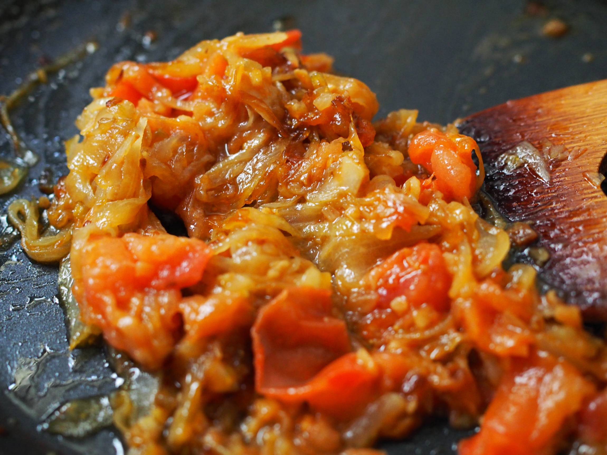 玉ねぎの水分がある程度飛んだら、トマトを入れて潰しながら炒めます。