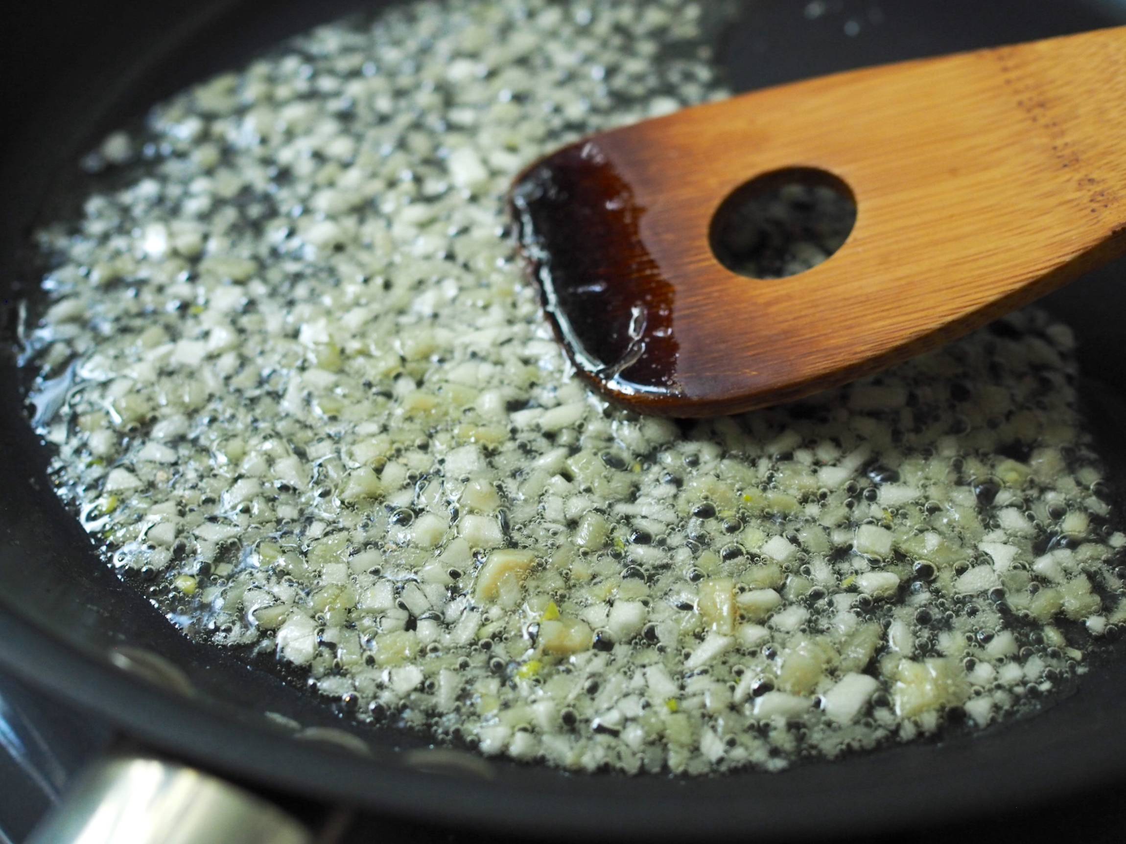 フライパンに米油、にんにく、しょうがを入れます。弱火にかけたら、表面がシュワシュワとして、香りが出てくるまで炒めます。