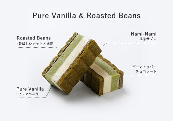 「Gelato Koki ×Nami-Nami/抹茶サブレ」 「抹茶サブレ」には、“ピュアバニラ”と“ロースティッドビーンズ”の香り豊かな2種のジェラートをサンドしています。豆とお茶の共通香、花のような香り“リナロール”を感じる、ピスタチオのような味わいをぜひ試してみてください。
