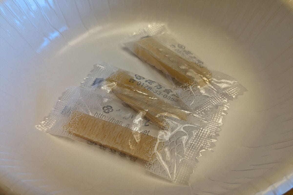 手に入れるには車なら朝食に八食センターで勝手丼などを食べたあと、ついでにお土産でなかよしを買うのがもっとも簡単かも。電車の人は八戸駅などで販売しているので、そちらで買っても良し。
