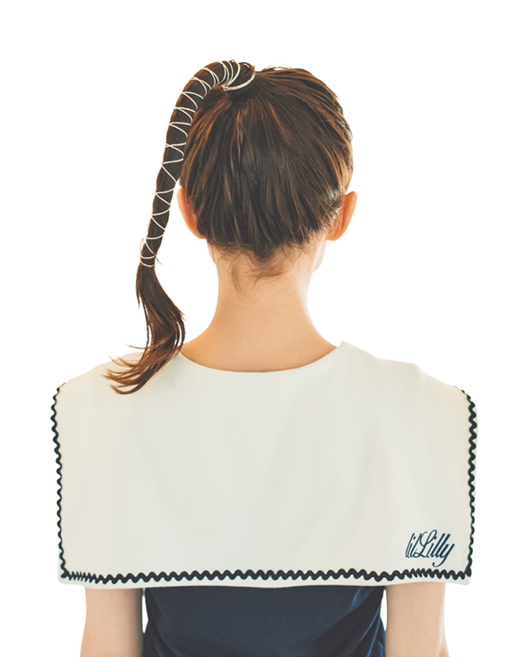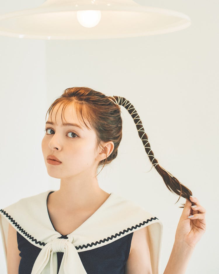麻っぽいドライな質感のひもを用意。それをポニテの根元から巻きつける。ひもをクロスさせながら巻いていって、毛先10㎝程度残したところでストップ。ひもをリボン結びしてとめる。