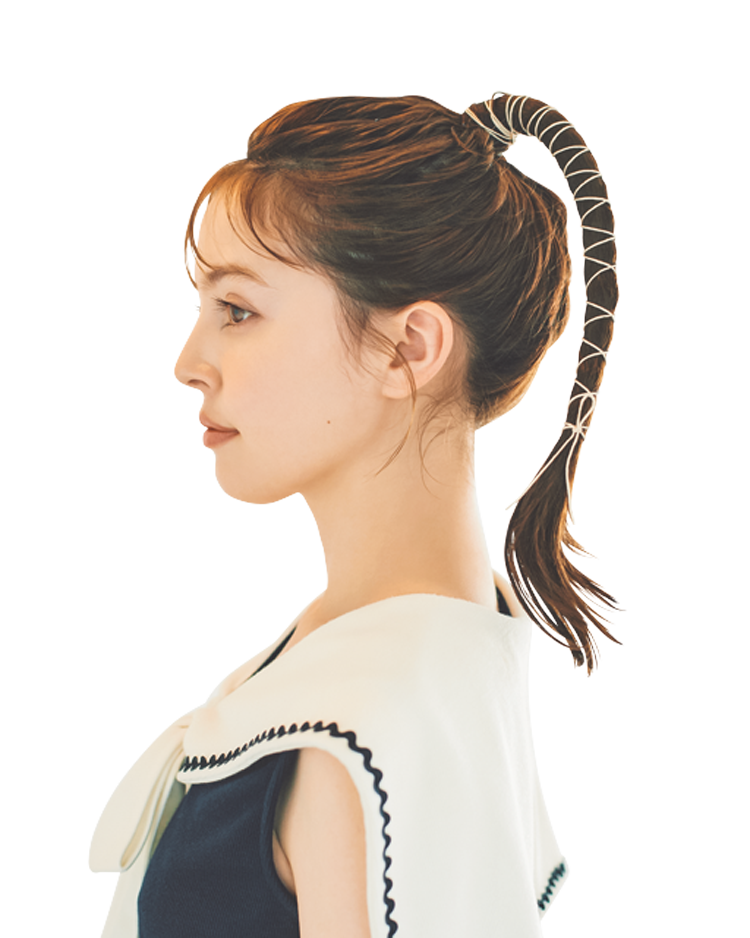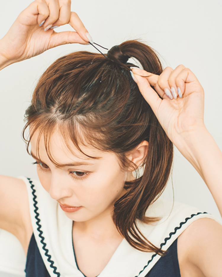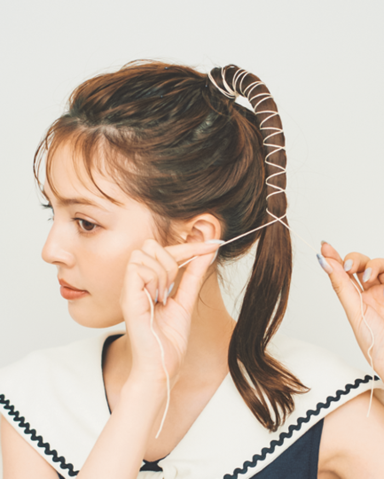1でつくったポニテの結び目は、少量の髪を巻きつけてゴム隠しをする。ゴムをちゃんと隠しておいたほうが、そのあとに巻きつけるひもが目立っておしゃれに仕上がるから忘れずに。