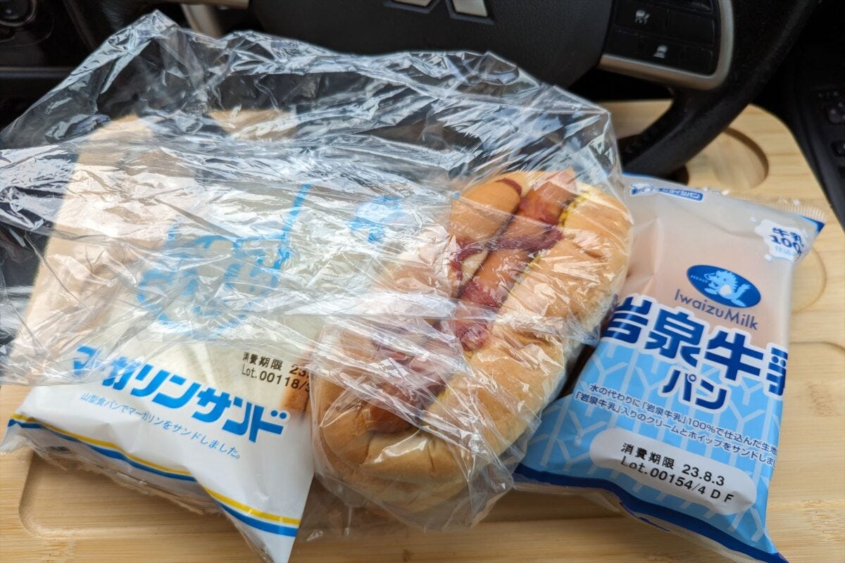 店内は撮影することがNGなので購入した製品をお見せすると、定番のマーガリンサンドと岩泉牛乳パン、そしてアウトレット価格のチョリソー入りのパンの3点。
