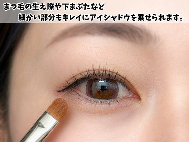 そして目のキワや目尻、目尻下など色を濃く入れたい場所や細かい部分を塗る時は小さいブラシを使っていきます。
