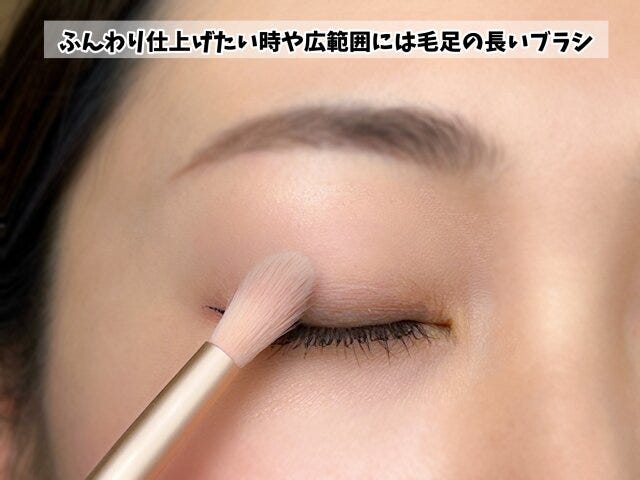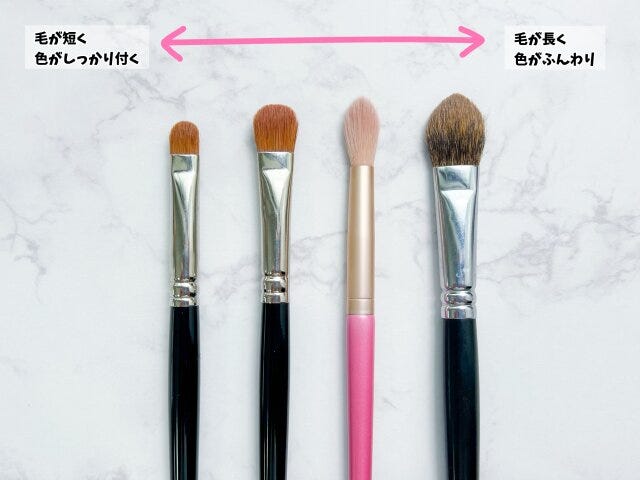 毛の短いブラシは色がしっかりつきやすく、毛が長いブラシは色がふんわりとつきます。アイシャドウを使ってメイクするときは、アイメイク用のブラシを使うと色のグラデーションがキレイになったり、細かい部分までメイクすることができるんです。