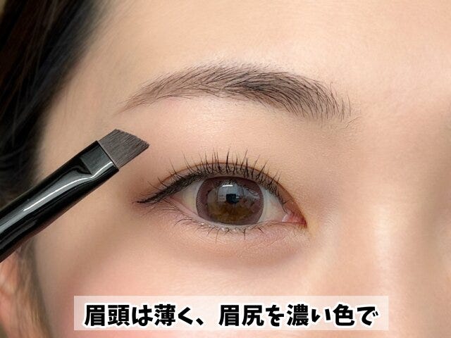 色が複数色入っているものは、色が薄い方を眉頭に。色が濃い方を眉尻に乗せて眉をグラデーションにしていくんです。筆を使ってパウダーをのせていくので、ふんわりとナチュラルな眉に仕上がり、のっぺり眉を回避することができるアイテムなんです。