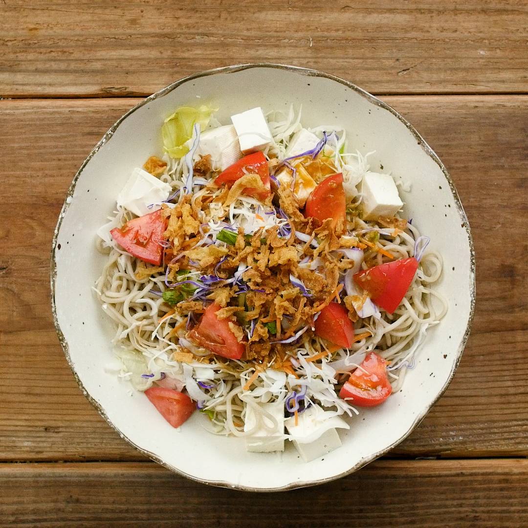 器に②のそば、豆腐、カット野菜、トマトを盛り、 ①のドレッシングをかけ、フライドオニオンをちらして完成です。