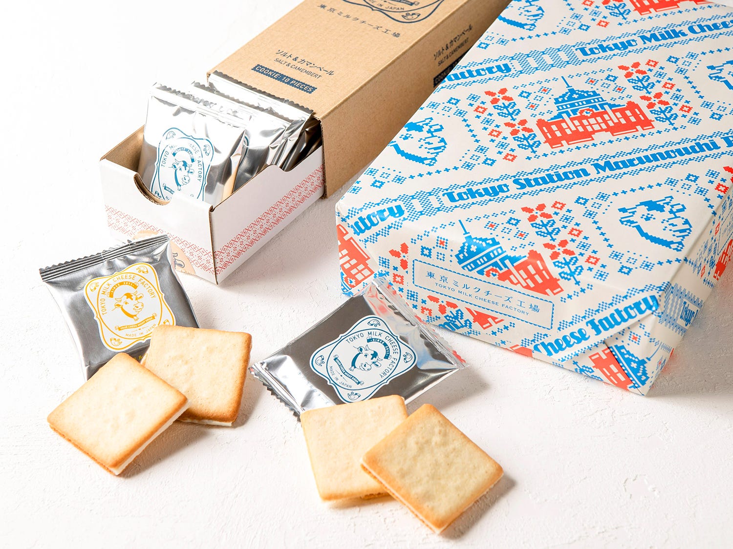 東京駅限定の駅舎PKG。東京ミルクチーズ工場の大人気商品、北海道産牛乳とフランス産ゲランドの塩を使った生地に、カマンベールチーズのチョコレートをサンドした「ソルト&カマンベールクッキー」と、スペイン産ローズマリー蜂蜜を練り込んだ生地に、濃厚なゴルゴンゾーラのチョコレートをサンドした「蜂蜜&ゴルゴンゾーラクッキー」が、それぞれ10枚ずつ入っている。オリジナル包装紙で包まれており、大事な人への贈り物や自分へのご褒美にもぜひ。
