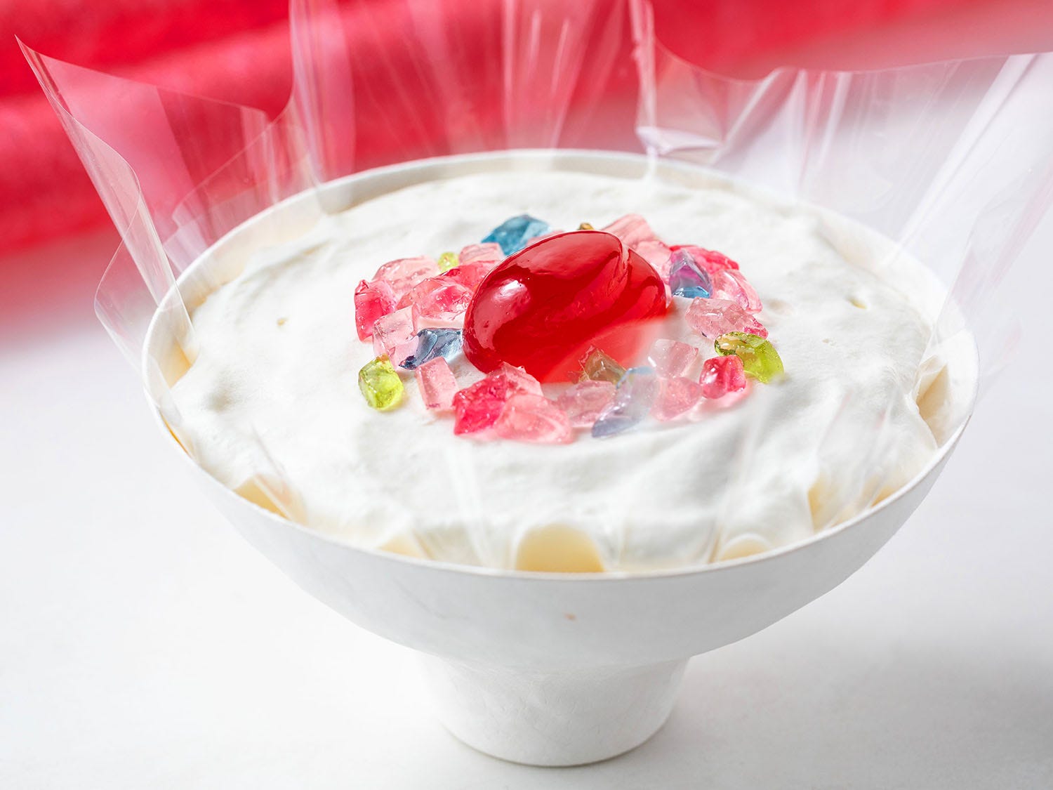 ふわっとみずみずしいフレッシュレアチーズに甘酸っぱいルビーラズベリーゼリー&爽やかなクリスタルレモンゼリーを合わせた「チーズケーキ ルビーカラーブーケ」。スプーンですくいあげると真っ赤なベリーソースのリボンが絡まり、見た目もまさに花束そのもの。