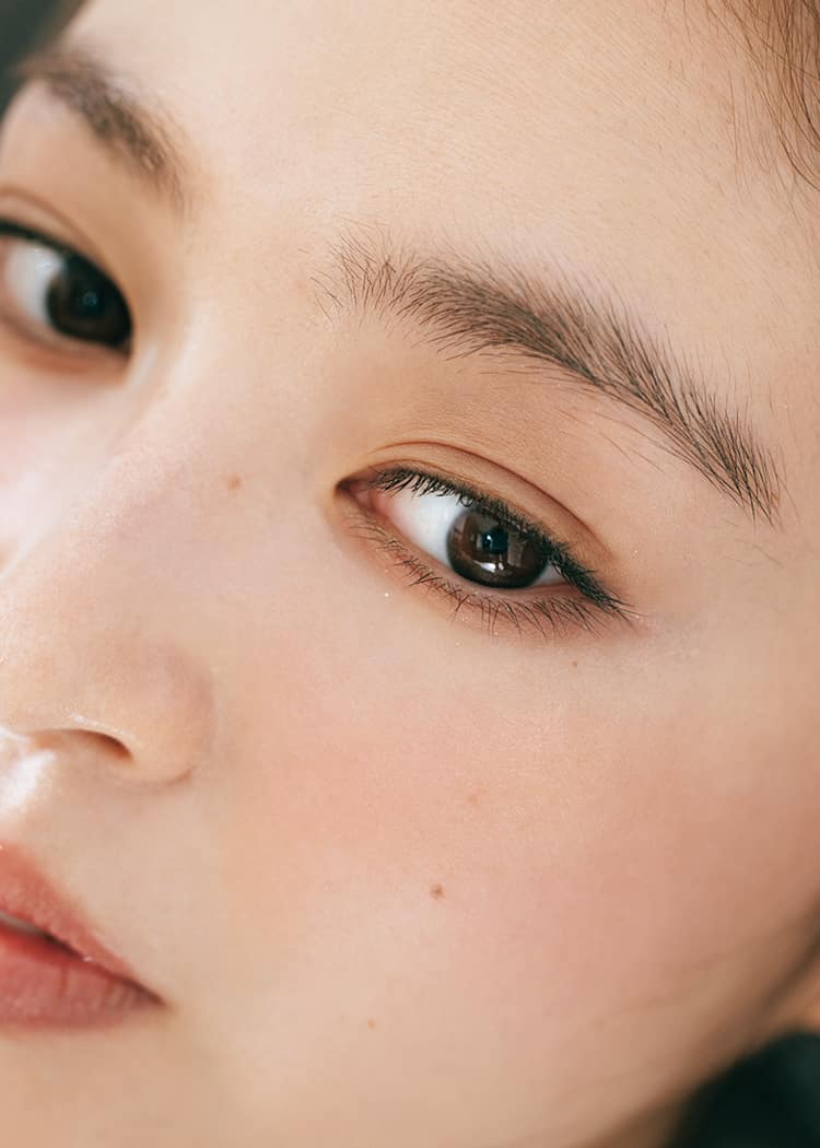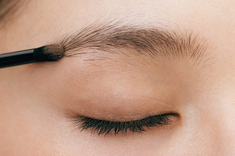 目元と同じくaの1を小さめのブラシにとり、眉全体にもふんわりとのせる。目と眉にセットで仕込んだシェードで、目まわりの印象をさりげなく強く見せられる。