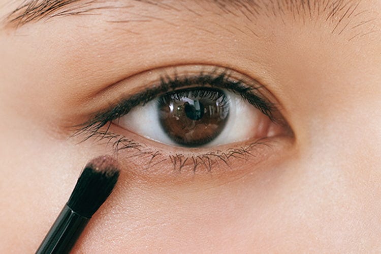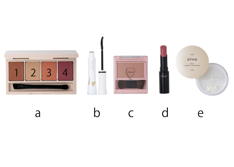 ①まぶたに色をのせる上まぶたはaの1と2を混ぜてベージュトーンの影色をつくり、アイホールに広げる。下まぶたにはaの3と4を混ぜて赤み系カラーを目のきわ全体に仕込む。