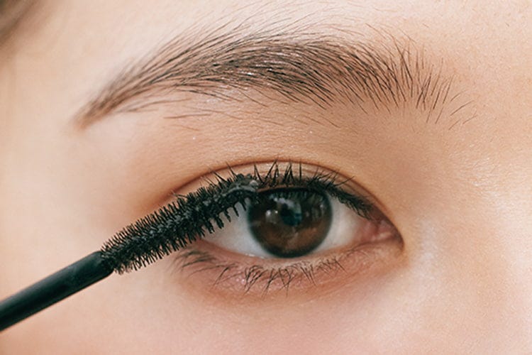 しっかりとカールをつけたまつ毛にbを根元からたっぷりとつける。上まつ毛メインで、下まぶたにはさらっと軽くつける程度でOK。