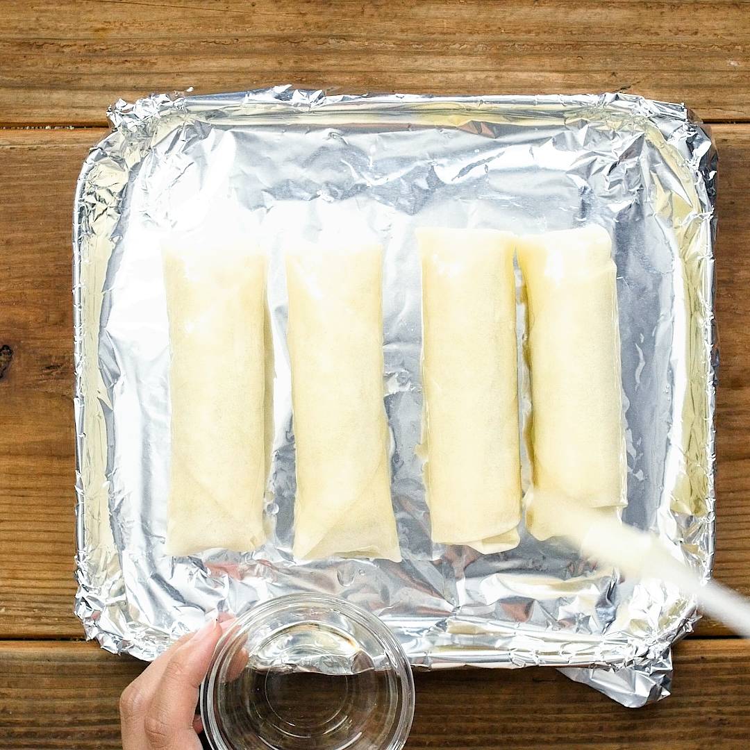 バットにアルミホイルを敷き、春巻きを並べたらサラダ油を全体にぬります。