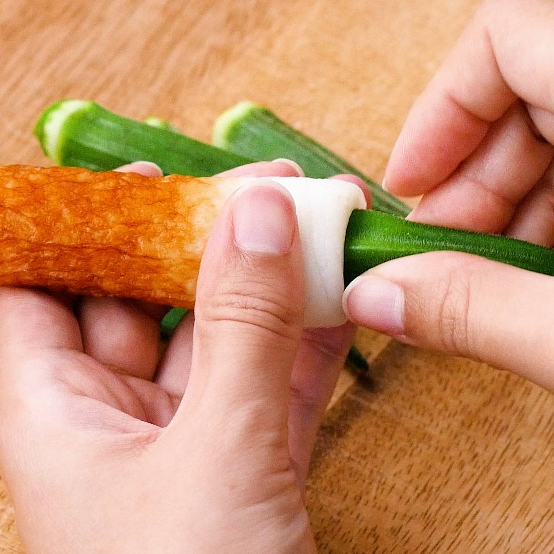 ちくわにオクラを詰め、チーズを巻きます。春巻きの皮で巻き上げて、水溶き小麦粉で巻き終わりをとめます。