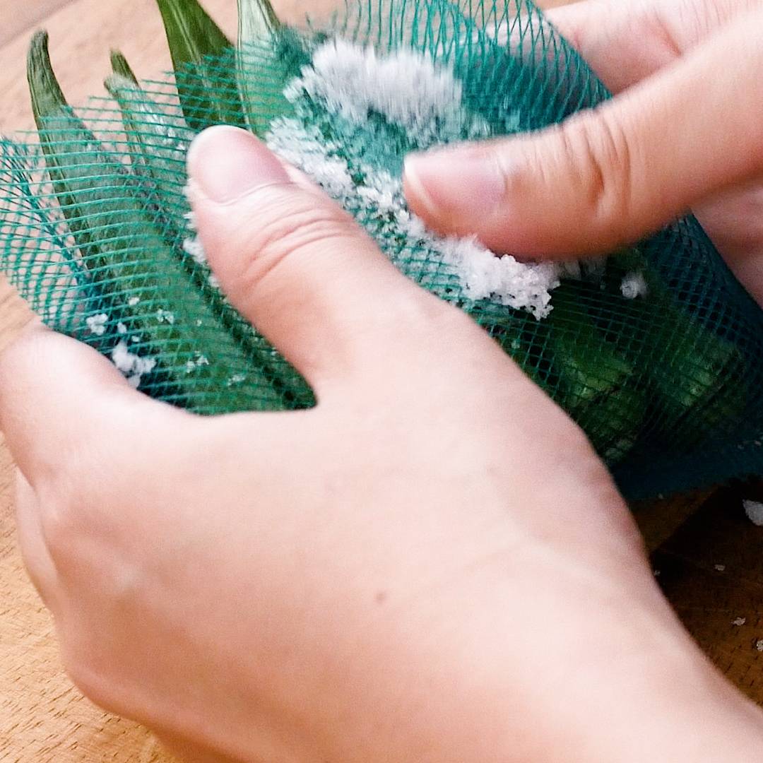 塩をつけたまま熱湯で1分ほどゆで、冷水にとります。ヘタとガクを取り除いて、水分を拭き取ります。