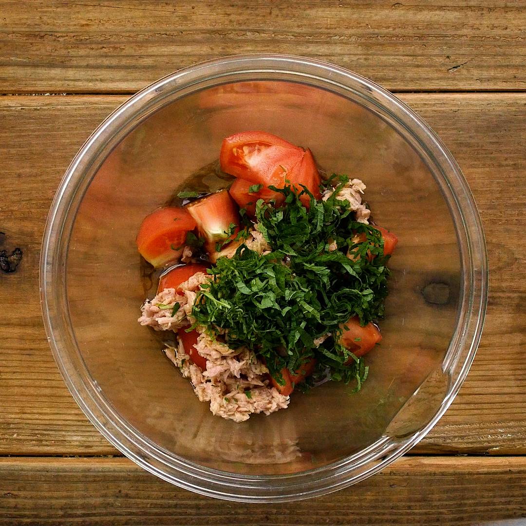 ボウルにトマト、ツナ缶をオイルごと入れます。めんつゆ、オリーブオイル、半量の大葉を加えます。