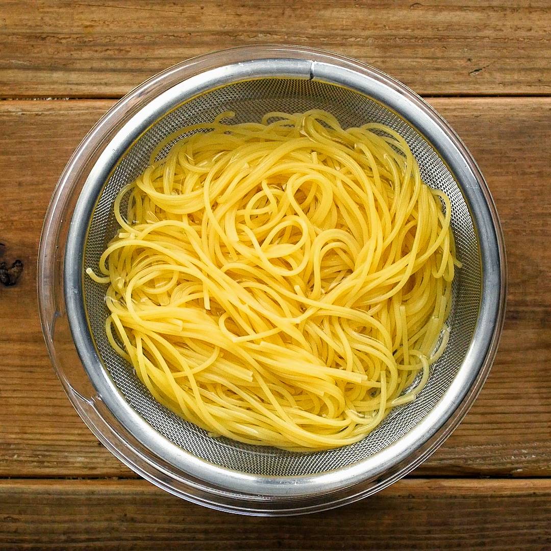 鍋に水、塩を入れて沸騰させ、スパゲッティを加えます。表記通りにゆでたら、冷水にとり、水気を切ります。