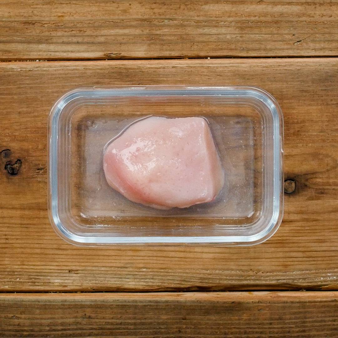 鶏肉を耐熱容器に入れ、フォークで穴をあけて(a)をもみこみます。ふんわりラップをかけ、レンジ600Wで1分30秒〜2分加熱し、粗熱がとれるまで置きます。