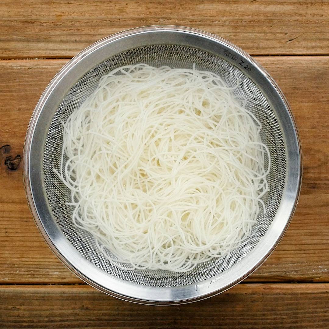 鍋にたっぷりの水(分量外)を沸騰させ、そうめんを表記時間通りにゆでます。ざるにあげ、冷水にさらします。