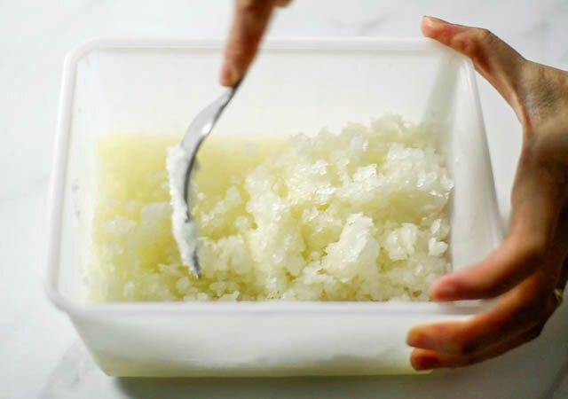 ⑥ 固まってきたら途中で冷凍庫からとりだしフォークで削るようにしてかき混ぜます。再び冷凍庫へ入れます。