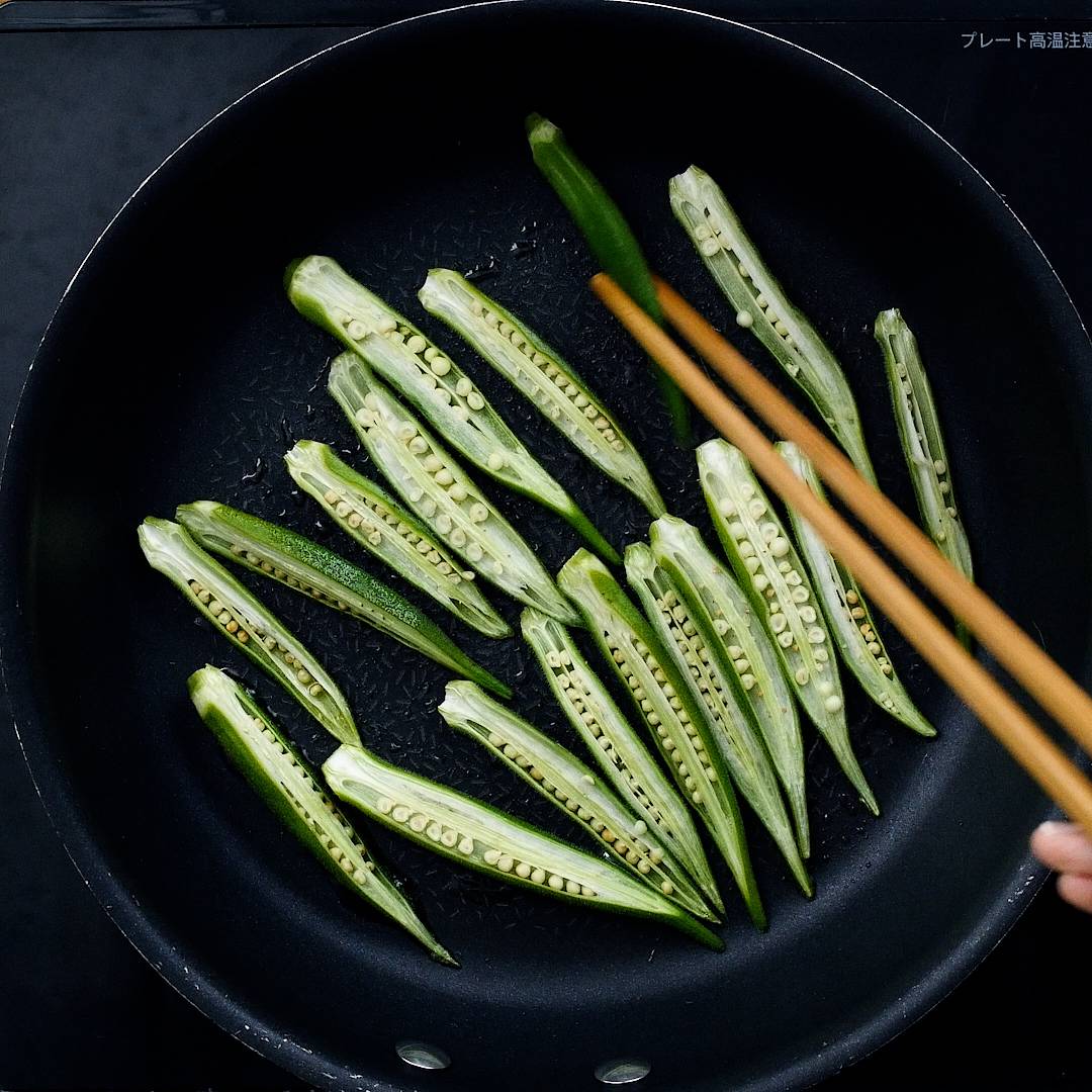 フライパンにごま油を引いて熱し、オクラを並べて両面焼きます。