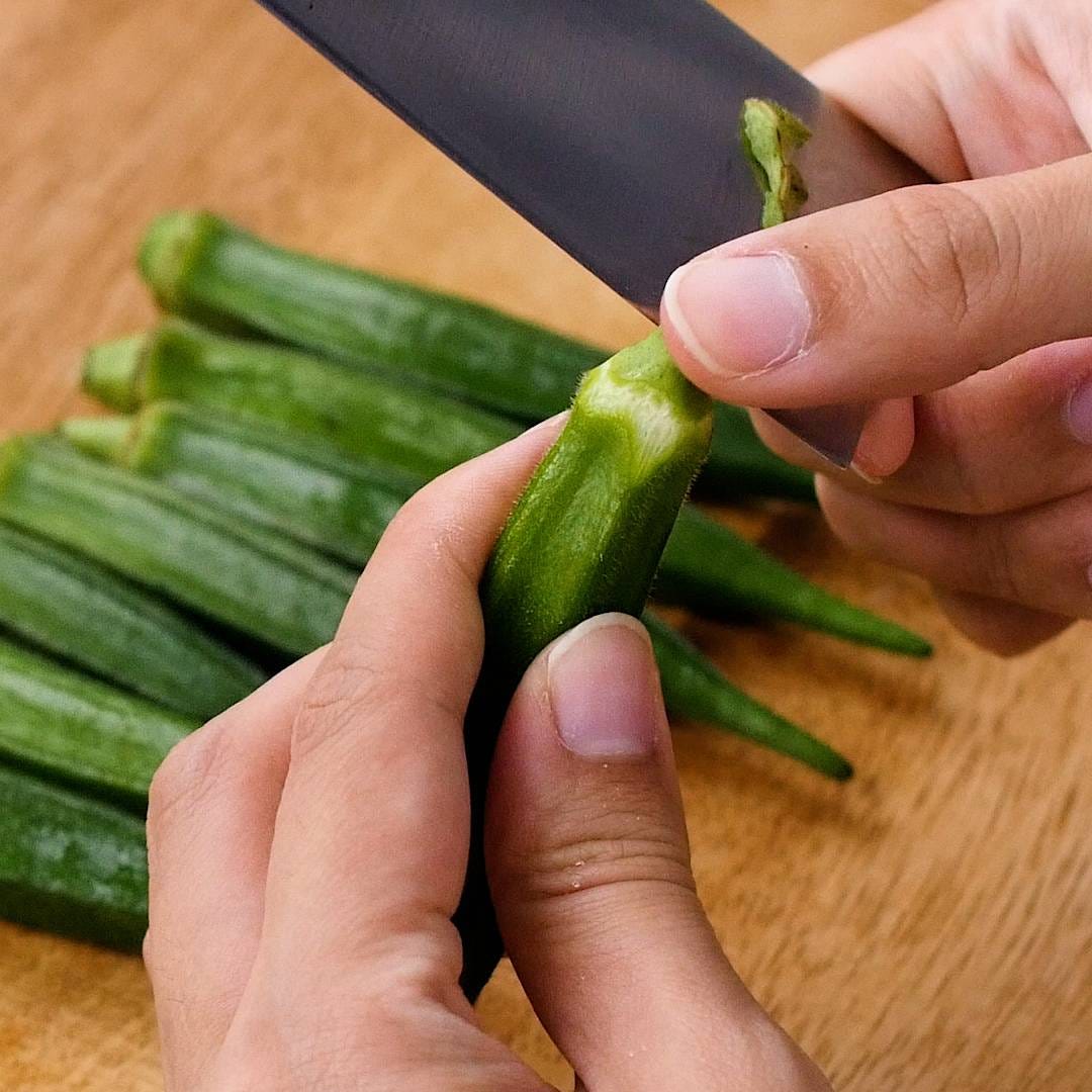 オクラの水分を拭き取り、ヘタの周りの固い部分を包丁で削って縦半分に切ります。